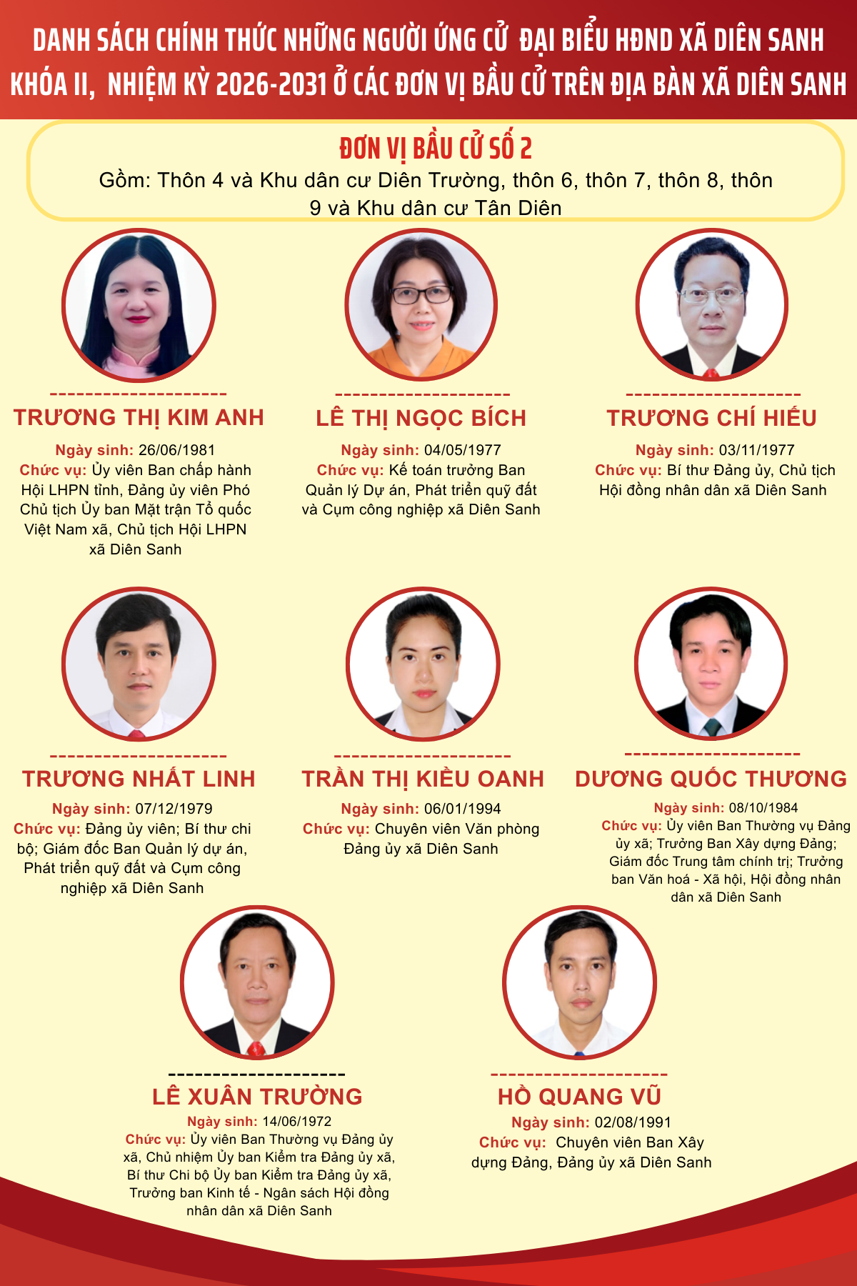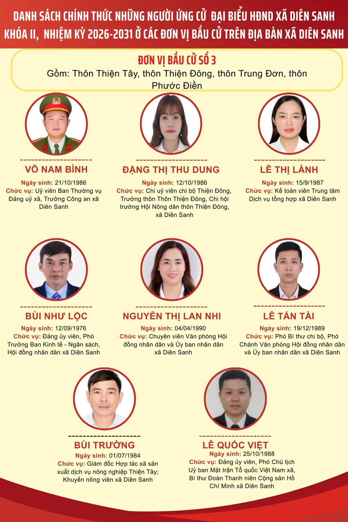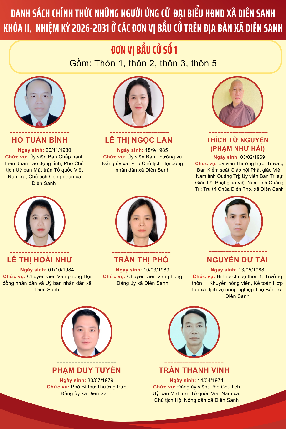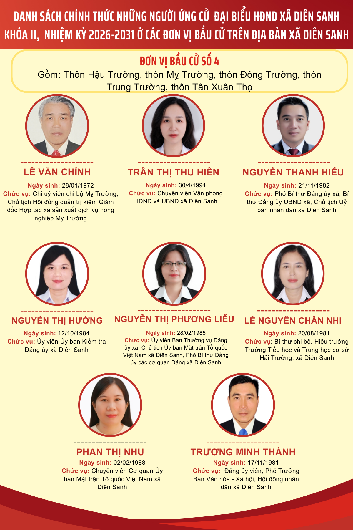 Danh sách các ứng cử viên ứng cử đại biểu HĐND xã Diên Sanh nhiệm kỳ 2026-2031 tại 4 đơn vị bầu cử