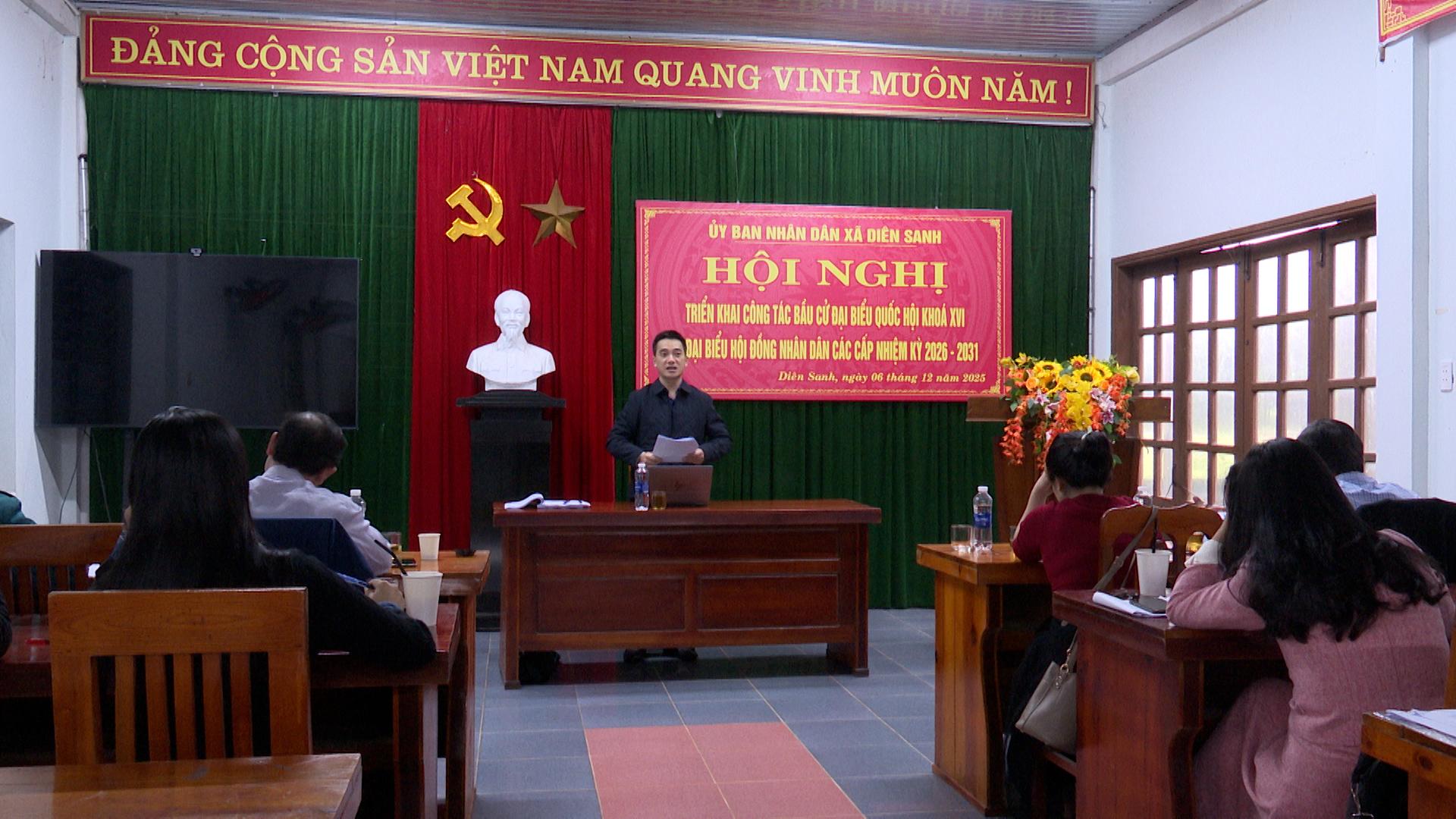 Ngày 6/12, Ủy ban Bầu cử xã Diên Sanh đã tổ chức hội nghị Hội nghị triển khai công tác bầu cử Đại biểu Quốc hội kháo XVI và Đại biểu HĐND các cấp nhiệm kỳ 2026-2031. Đồng chí Nguyễn Thanh Hiếu-Phó Bí thư Đảng ủy, Chủ tịch UBND xã, Chủ tịch Ủy ban bầu cử đại biểu Hội đồng nhân dân xã Diên Sanh nhiệm kỳ 2026-2031 chủ trì hội nghị.