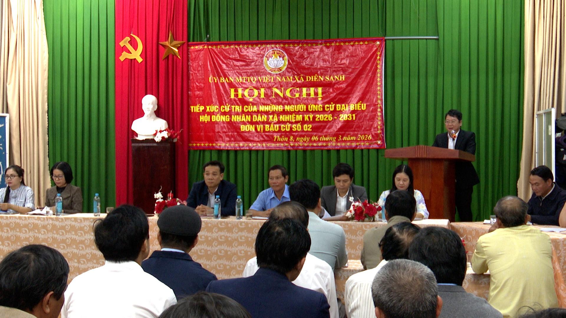 Từ ngày 2 tháng 3 đến ngày 7 tháng 3 năm 2026, trong khuôn khổ hoạt động chuẩn bị cho ngày bầu cử đại biểu Quốc hội khóa XVI và đại biểu HĐND các cấp nhiệm kỳ 2026 - 2031, Ủy ban MTTQ Việt Nam xã Diên Sanh đã tổ chức các hội nghị tiếp xúc cử tri để người ứng cử đại biểu HĐND xã thực hiện quyền vận động bầu cử.