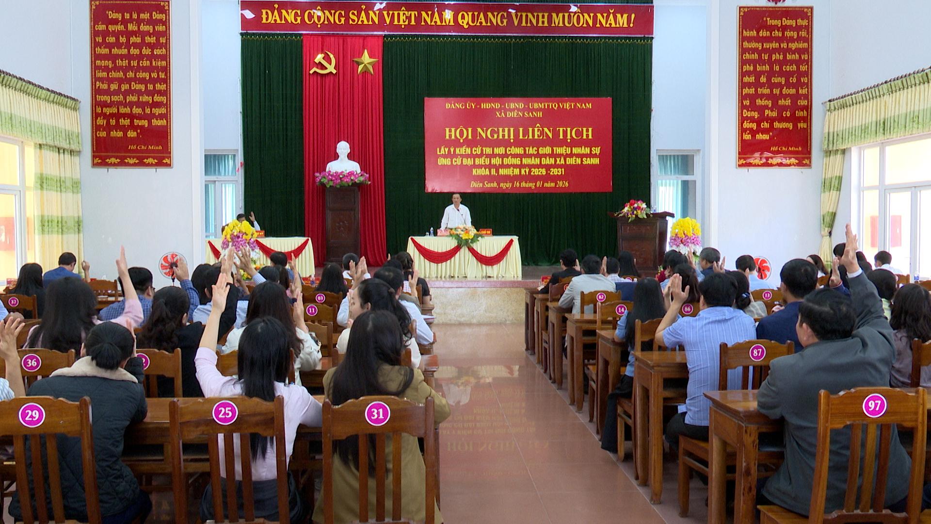Tại hội nghị Liên tịch lấy ý kiến cử tri nơi công tác đối với người được giới thiệu ứng cử đại biểu HĐND xã do đồng chí Lê Xuân Nam-Ủy viên BTV, Phó Chủ tịch UBND xã chủ trì đã thông qua danh sách các đồng chí thuộc Thường trực Đảng ủy, Thường trực HĐND, UBND, cơ quan thuộc UBND, Ủy ban MTTQVN, tổ chức chính trị xã hội đã giới thiệu ứng cử Đại biểu HĐND xã Diên Sanh nhiệm kỳ 2026-2031, điều kiện, tiêu chuẩn của đại biểu HĐND.