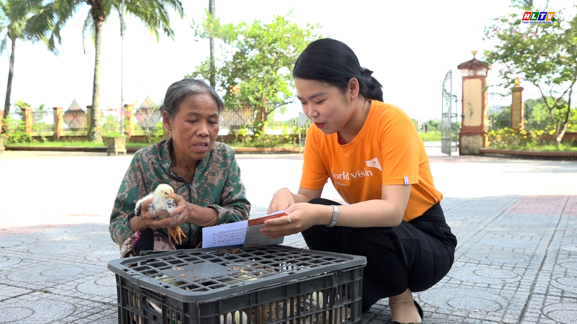 Cán bộ chương trình Tài chính Vi mô Hải Lăng hướng dẫn chị Dương Thị Tâm một số lưu ý khi nuôi gà