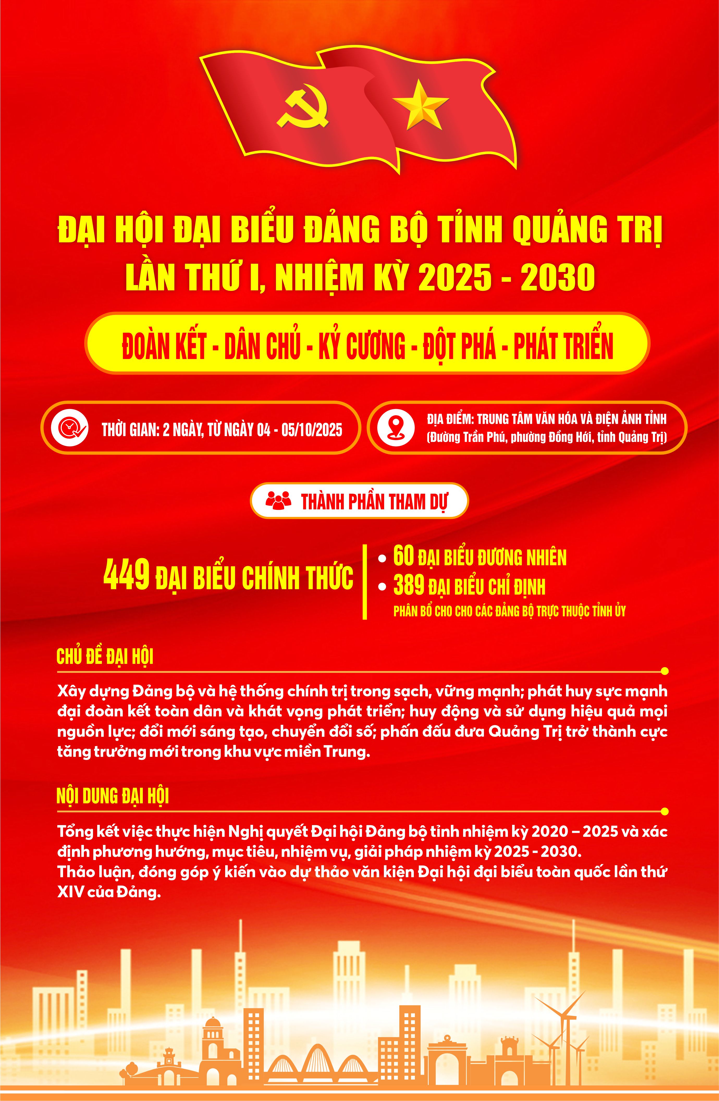 Đại hội đại biểu Đảng bộ tỉnh Quảng Trị lần thứ I, nhiệm kỳ 2025 - 2030 với chủ đề “Xây dựng Đảng bộ và hệ thống chính trị trong sạch, vững mạnh; phát huy sức mạnh đại đoàn kết toàn dân và khát vọng phát triển; huy động và sử dụng hiệu quả mọi nguồn lực; đổi mới sáng tạo, chuyển đổi số; phấn đấu đưa Quảng Trị trở thành cực tăng trưởng mới trong khu vực miền Trung” sẽ diễn ra trong 2 ngày 4 và 5/10/2025 tại Trung tâm Văn hóa và Điện ảnh tỉnh.