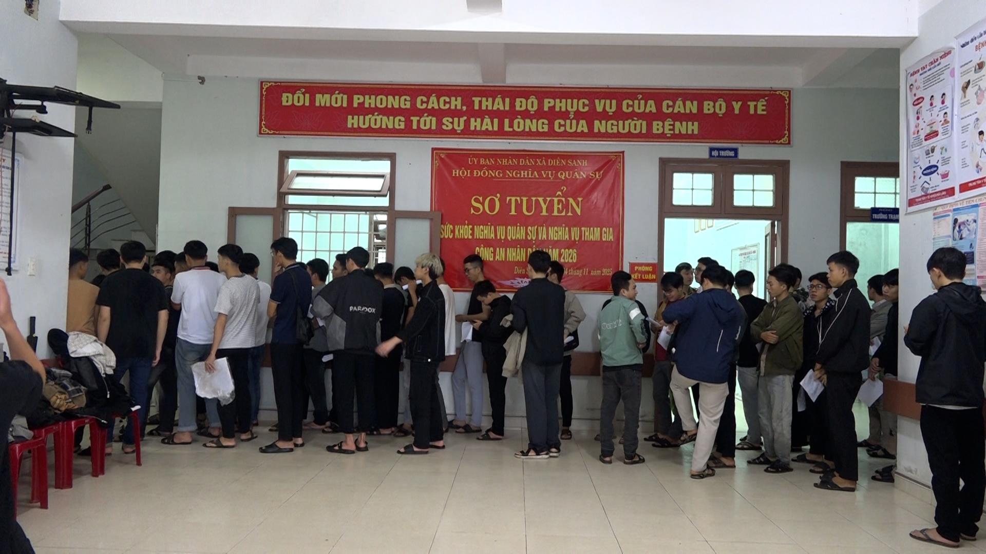 Nhằm tuyển chọn những thanh niên trong độ tuổi, có sức khỏe tốt, chủ động trong công tác chọn nguồn, chuẩn bị sẵn sàng cho công tác tuyển chọn và gọi công dân nhập ngũ năm 2026 theo đúng quy định, Hội đồng nghĩa vụ quân sự xã phối hợp Trạm Y tế xã Diên Sanh tổ chức khám sơ tuyển cho 418 thanh niên trong danh sách đủ điều kiện khám sức khỏe nghĩa vụ quân sự và nghĩa vụ tham gia công an nhân dân năm 2026.