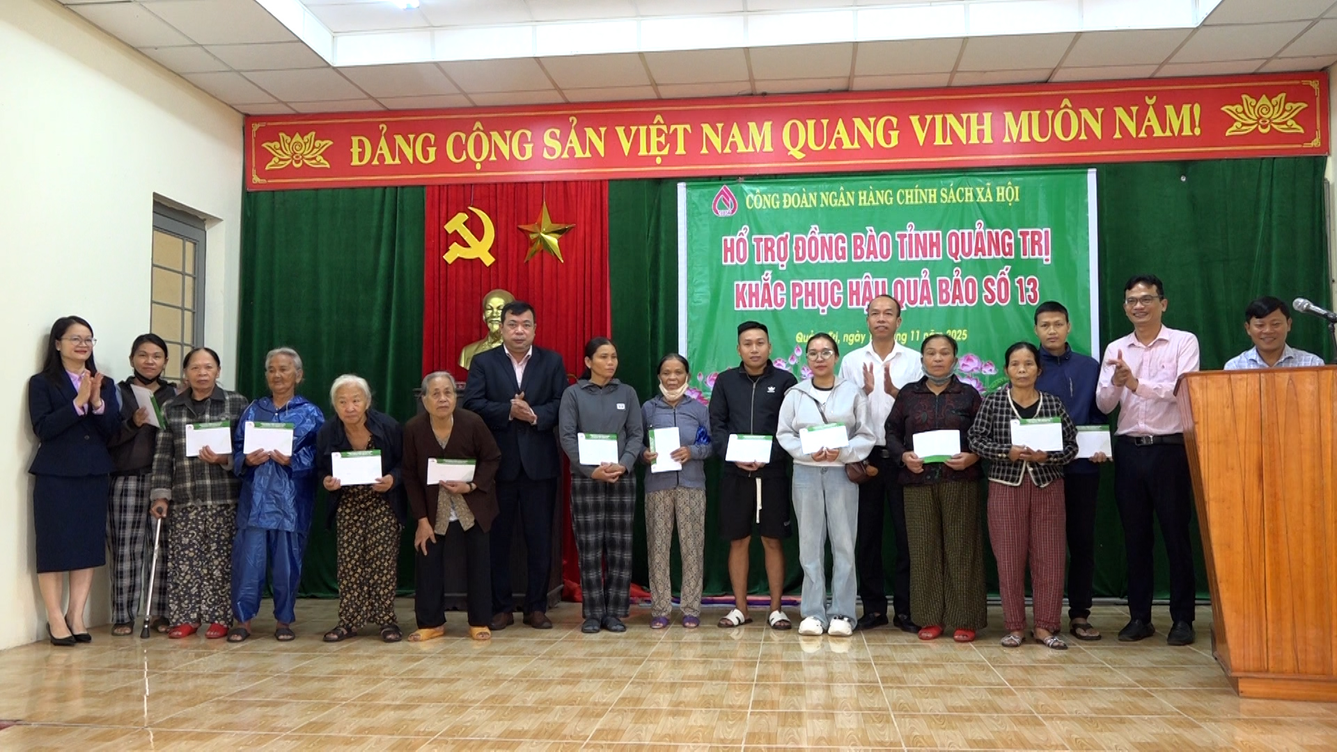 Ngày 13/11, thừa ủy quyền của Công đoàn Ngân hàng Chính sách xã hội Việt Nam, Công đoàn Ngân hàng Chính sách xã hội tỉnh Quảng Trị đã tổ chức trao quà ủng hộ các hộ dân bị thiệt hại do bão, lũ gây ra trên địa bàn xã Diên Sanh.