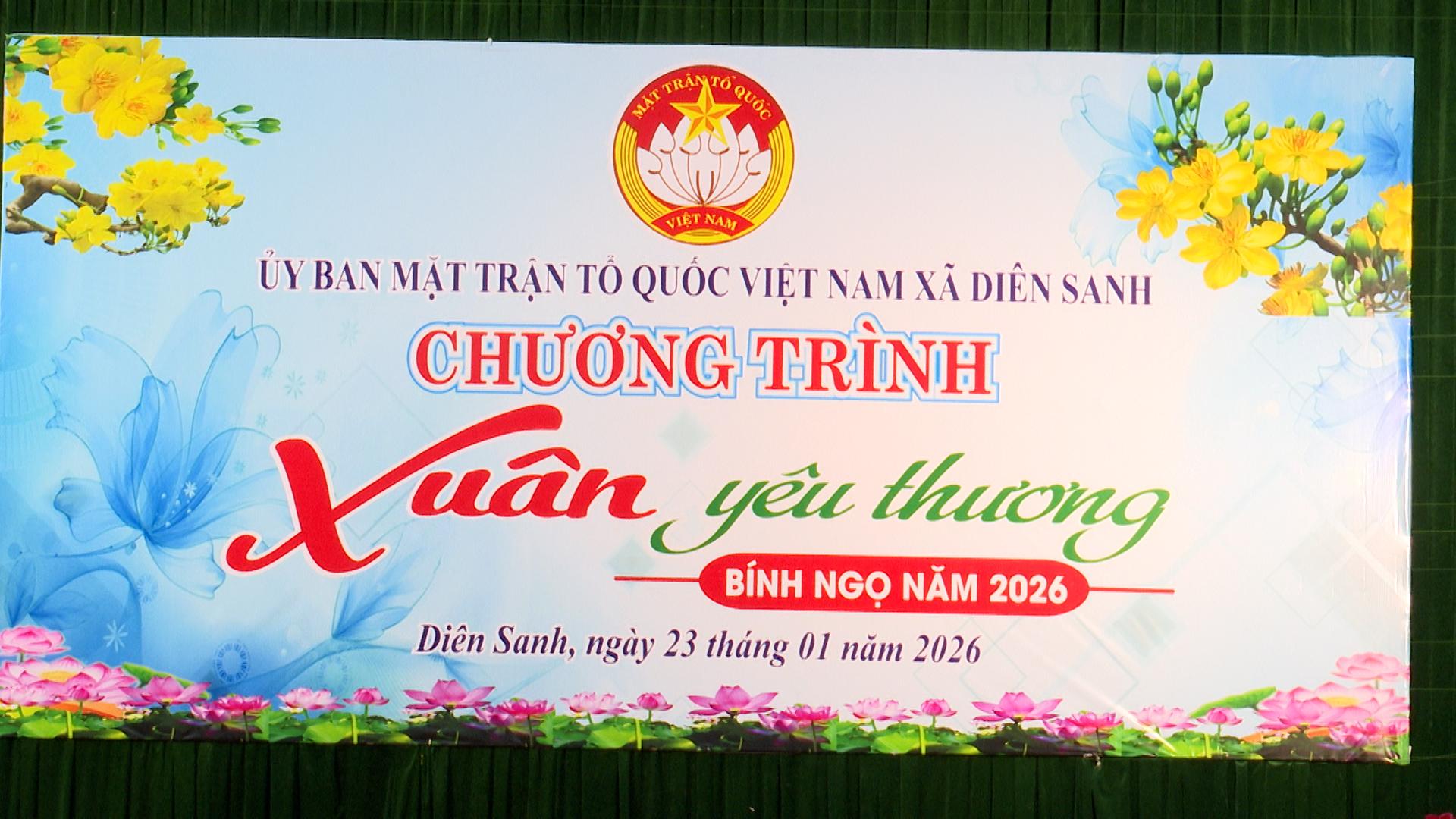 Ngày 23/01/2026, Ủy ban MTTQVN xã Diên Sanh phối hợp với các đơn vị hảo tâm tài trợ, tổ chức chương trình “Xuân yêu thương” năm 2026 để trao tặng quà cho các hộ gia đình có hoàn cảnh khó khăn trên địa bàn xã. Đồng chí Trương Chí Hiếu-Bí thư Đảng ủy, Chủ tịch HĐND xã, các đồng chí lãnh đạo xã, nhà tài trợ cùng tham dự.